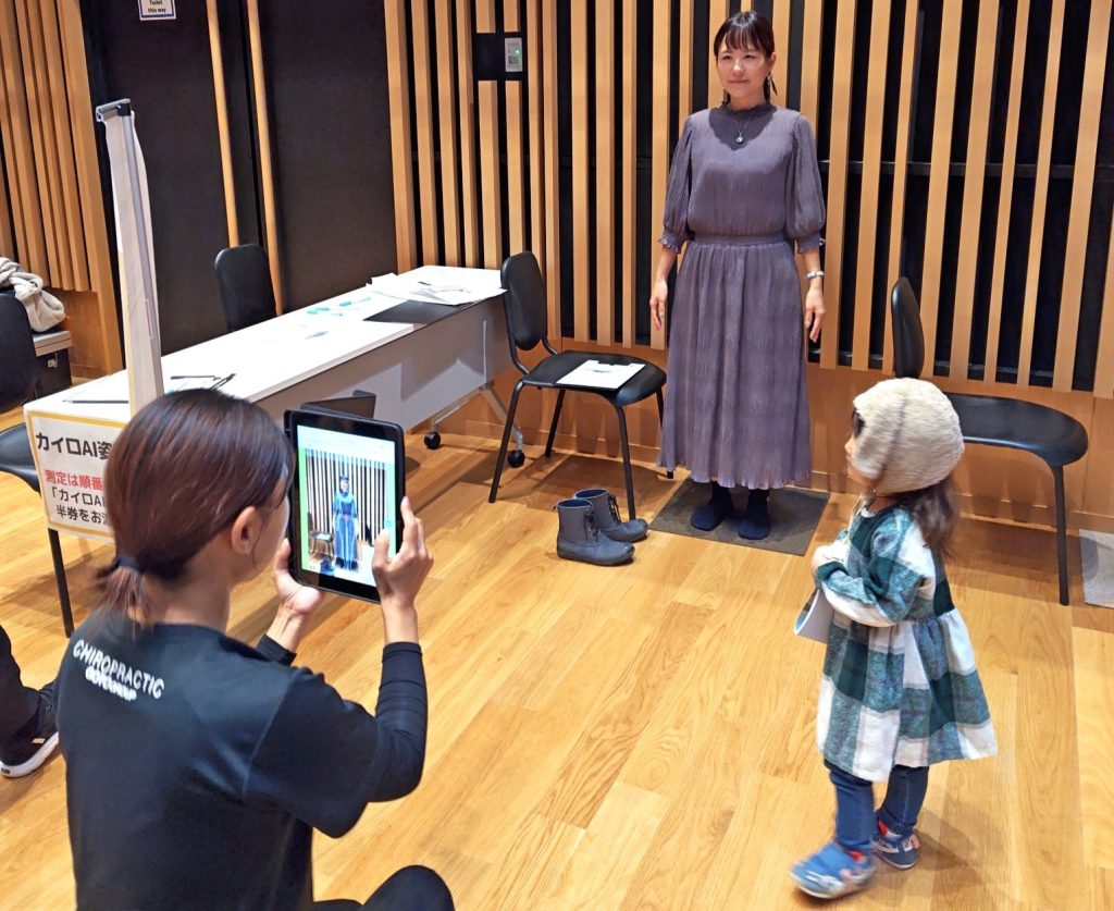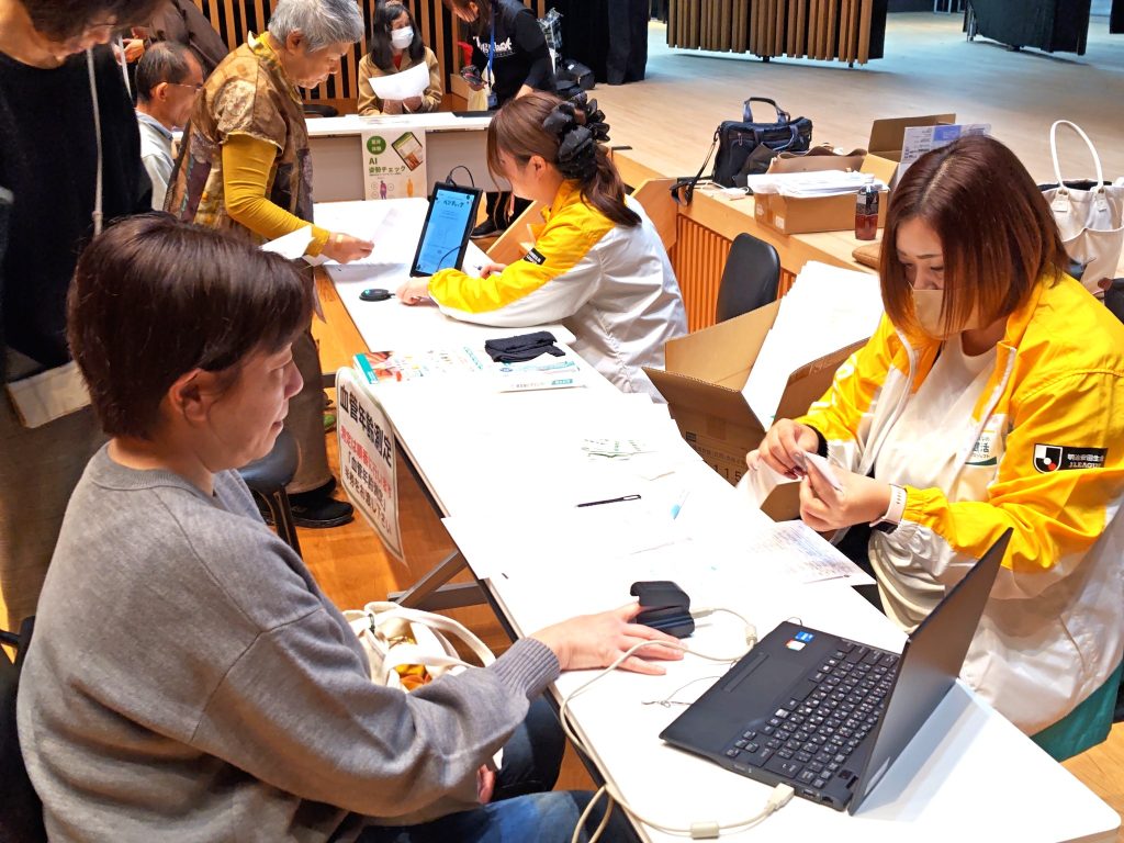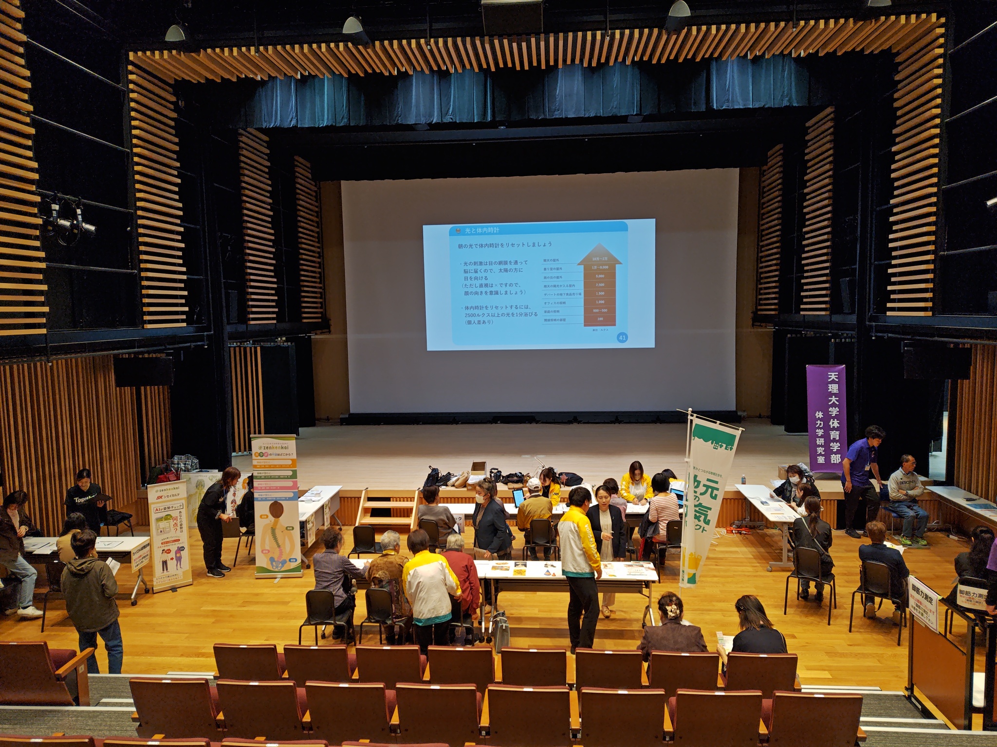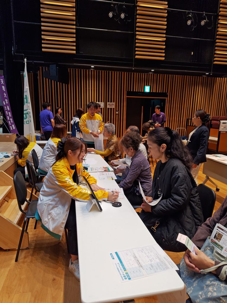 今回も、ホールでは「脚筋力測定」「ベジチェック®(推定野菜摂取量測定)」「血管年齢測定」等を実施。測定の待ち時間には、大きなスクリーンに健康講座ビデオを流し、健康クイズにご参加いただきました。